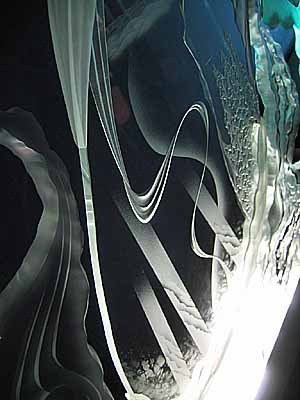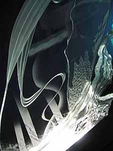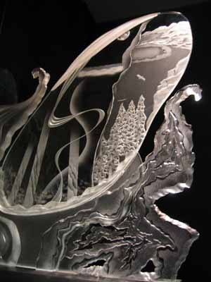 「エタニティー」 W550×H590×D160 高透過硝子(12mm・8mm・6mm使用)、ブラスト切断、エッチング、UV背着、研摩 |