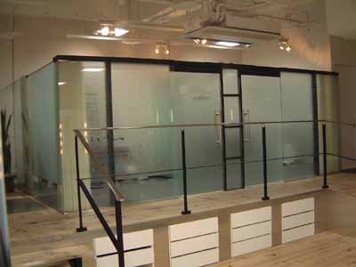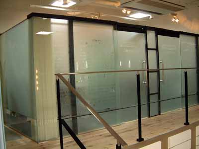 美容室VIPルーム 床はガラスタイル、取付金物の製作とエッチングガラスの製作施工をしました。 W6000×H3000 |