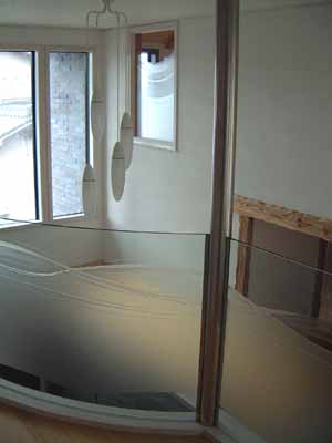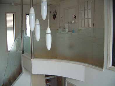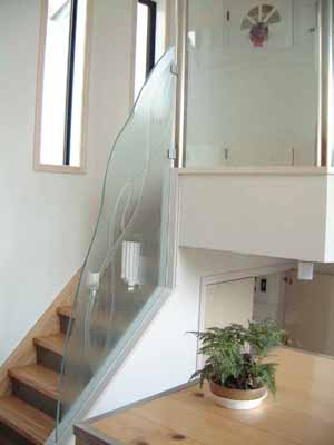 | 階段から踊り場にかけてトータルにデザインされているので、広がりを感じさせます。 FL15(H900×W2500) 曲げ硝子FL12(H900×W2400) FL12(H900×W800) |