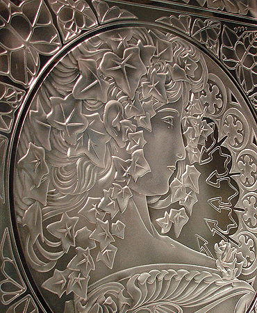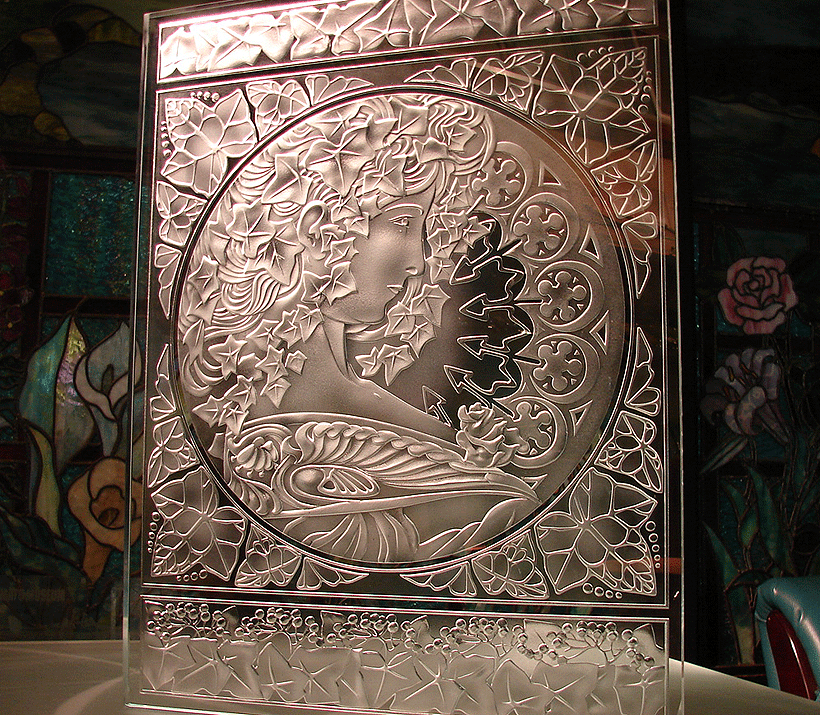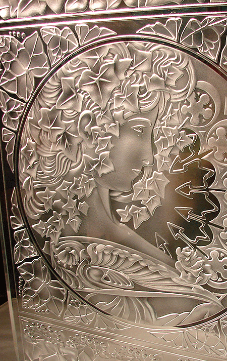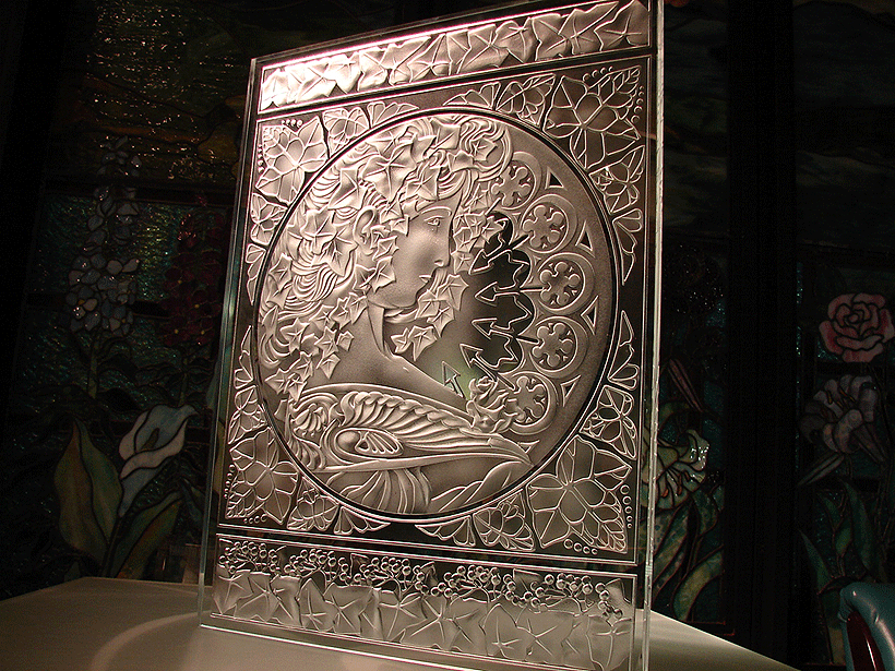 その華麗で美しいミュシャの世界を15mm厚の高透過ガラスに再現しております。