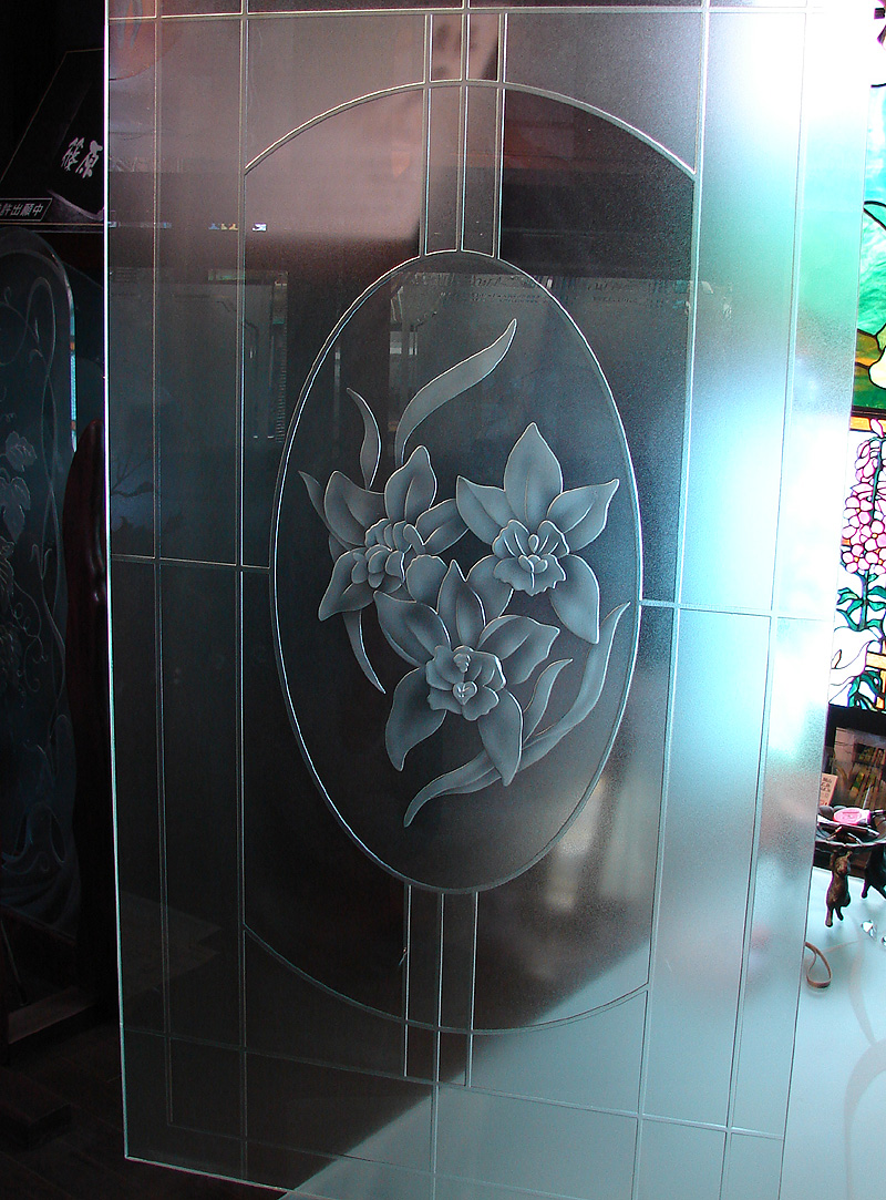 「ラン」 (W601×H1065 8mm厚 ) 立体彫りで陰影を演出し、周囲を薄いフロストと濃いフロストの濃淡をつけ、表情をつけています。