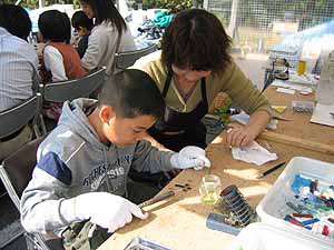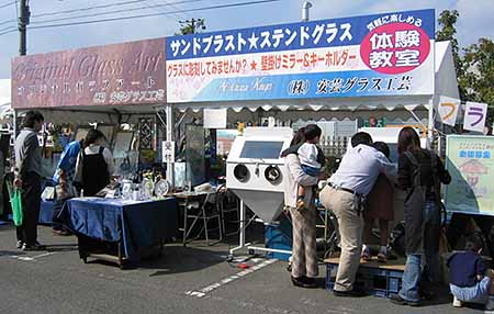 体験教室(サンドブラスト&ステンドグラス) ★サンドブラスト タンブラー、マグカップなど子供さん向けの物に人気が ありました。その他写真立てやお皿など用意していました。 ★ステンドグラス キーホルダー(ハート型とクロス型)と 壁掛け用鏡・フォトフレームを作りました。 ★アクセサリー フォトボンドでガラスピースをくっつけて 作るペンダントが、女の子に人気でした。 出来たその場で首に付けてニッコリ。 |