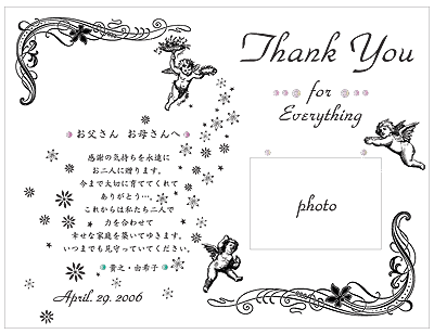 ![]() 標準でジュエリーが付いた豪華で華やかなデザイン。 こちらのデザインはご結婚記念にご両親へプレゼントして いただくサンクスボード専用のデザインです。こちら |