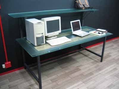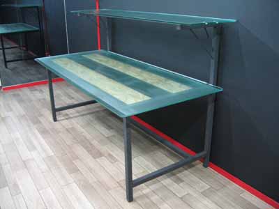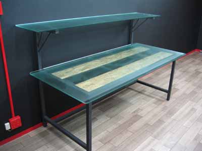 フロスト面を上に使う事でキズが付きにくく、また、フロストガラスを 通して見た木製パネルが落ち着いた雰囲気を演出しています。 フレーム金属製 天板一部木製パネル使用 テーブル全体サイズ:2200×1300×930 天板部:FL12(長二方24幅広面取り)W2200×H930 棚板部:TP8 W2200×H400 株式会社 安芸グラス工芸 広島県安芸郡海田町日の出町4-10 TEL (082)823-3845 FAX (082)823-3846 E-mail akiglass@nifty.com 担当 : 永田 |