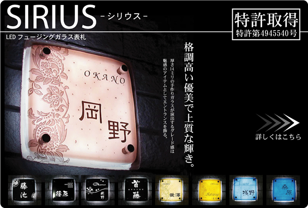 新商品 ハートビアグラス PB-6を追加しました! クリーミーな泡立ちが楽しめる、可愛いハートビアグラスが登場! グラスの内面に施された、すりガラス状の小さな凹凸がビールのの風味をおいしく変えます。 クリーミーな泡を長持ちさせ、ビールの旨さを倍加させます。 かわいい見た目に加え、おいしいビールを飲んでほしい。 そんな気持ちをグラスにのせて大事なあの方へオリジナルの彫刻を入れてプレゼントにどうぞ。 ![]() SIRIUS シリーズ 〜特許を取得しました〜 2012年3月、安芸グラス工芸は、LEDフュージングガラス表札シリーズ 「SURIUSシリーズ」の特許を取得しました。 SIRIUSシリーズは、ガラスの装飾に長く携わってきた安芸グラス工芸の高い技術と、 独自の創造力により開発された他には類のない輝きを持つLED表札シリーズです。 新電気炉完成!を追加しました。 自社で開発・設計から製造まで行い、駆動系も配備した大型電気炉が完成 (炉内サイズ 250×550×2700mm) 大型化により炉内の均一な温度管理が可能 品質の向上と より迅速な納期対応ができるようになりました。 ![]() ワンポイントデザイン(犬・猫、アルファベットマークなど)を追加しました。 新築記念プレートが追加されました。 新築の記念となる定礎プレートを表札ラインナップに追加致しました。 一般住宅の新築記念、安泰祈願として、玄関の入り口や外壁に取り付けられています。 ![]() クリアガラスステンレス表札 サンクレールシリーズが 追加されました。 ドイツの特殊メーカーの三角柱ガラスを使用した、現代建築に溶け込む、斬新なデザイン表札です。 スタイリッシュなライフスタイルを大切にする人にお勧めしたい 、シャープ&クリアー モダンデザインです。 ![]() カラーキルンステンレス表札 イノックスクレールシリーズが 追加されました。 しっとりした上品な艶のモダンカラーガラスと 匠にレザーカットされたステンレスをコラボした、新鮮で贅沢な表札です。 今までにはない、潤いのある質感を持ち合わせた、上品な光沢があるモダン表札です。 ![]() LED表札レイヤードシリーズ 新作が追加されました。 造形美を追及したLEDサインの最高峰。 丹念に重ねられたクリアガラスで構成された、繊細なテクスチャーが魅力です。 重ねられたクリアガラスが、輝く水の流れのような陰影を彩どる、光のオブジェのような表札です。